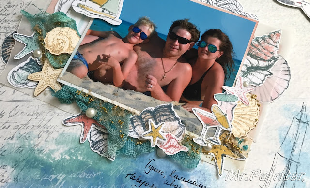 За основу взяла лист с такими сочными морскими разводами, а украсить все мне помогли ракушки и морские звезды из листа для вырезаний, я просто в восторге от этих нарисованных раковин, пальм и чаек, а так же чипборд ракушки.